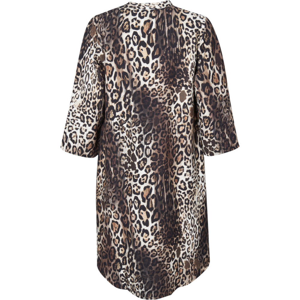 En avslappet og feminin kjole med rett passform og et dristig leopardtrykk som gir den et stilig preg og personlighet. Den har V-hals, 3/4-lange ermer og en løs silhuett for både komfort og stil. Det lette stoffet gir et vakkert fall og flyt.