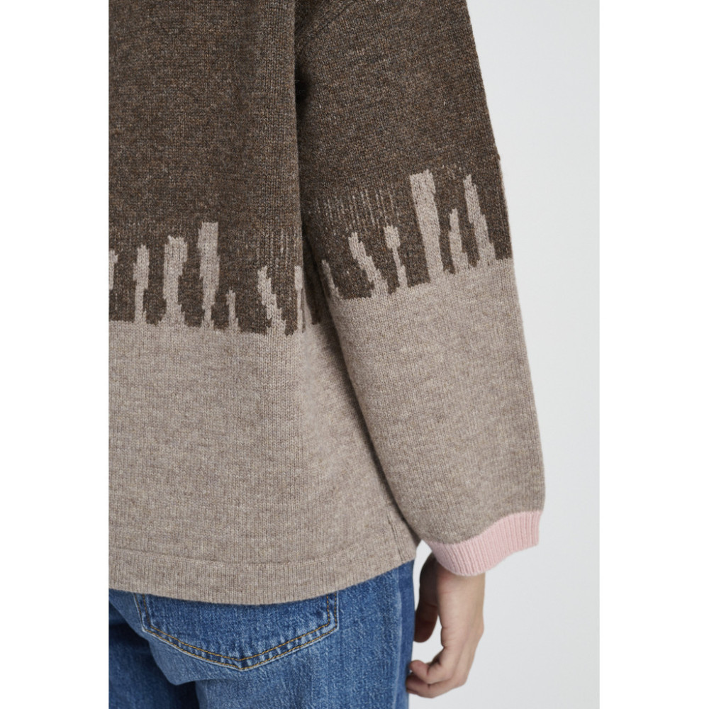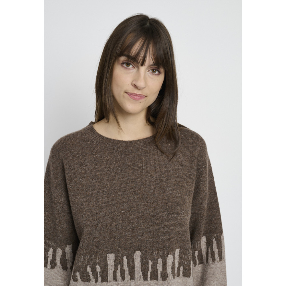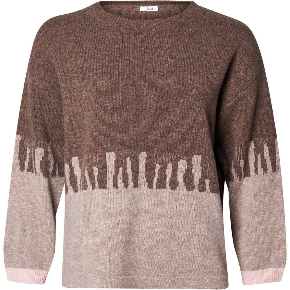Lind SCora D.Brown Mel En vakker og særegen strikkegenser i ren merinoull med et slående mønster over bryst og ermer. Genseren har en avslappet, rett passform med rund hals og lange ermer. Den myke merinokvaliteten...