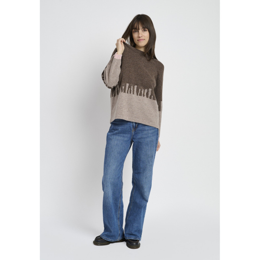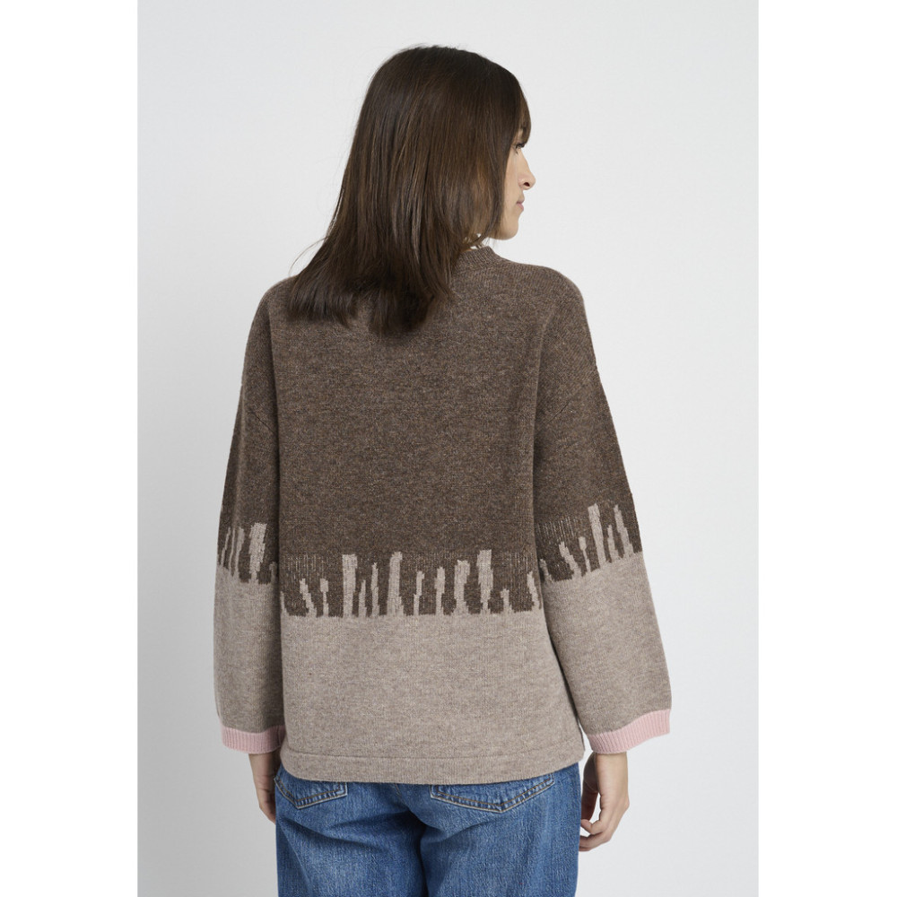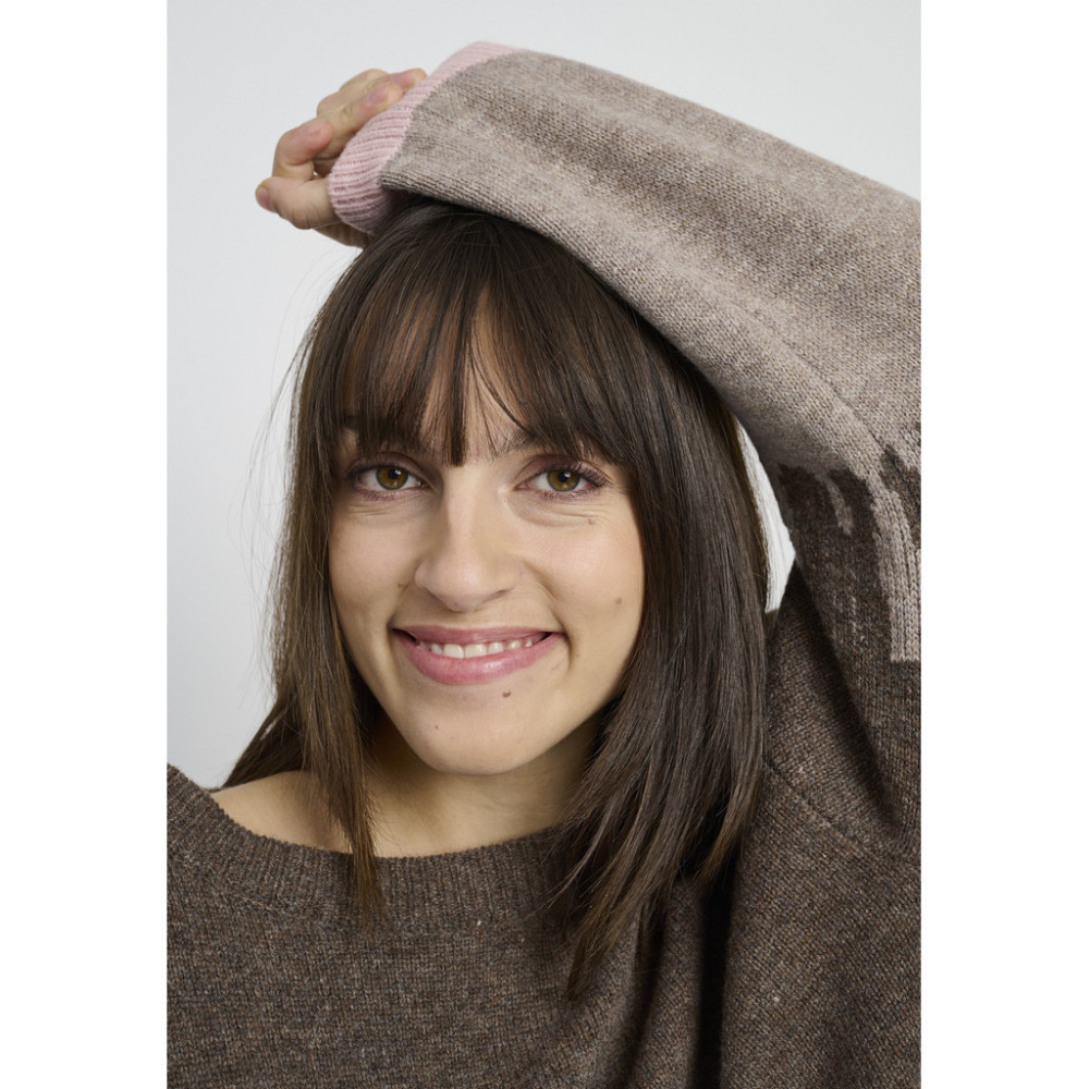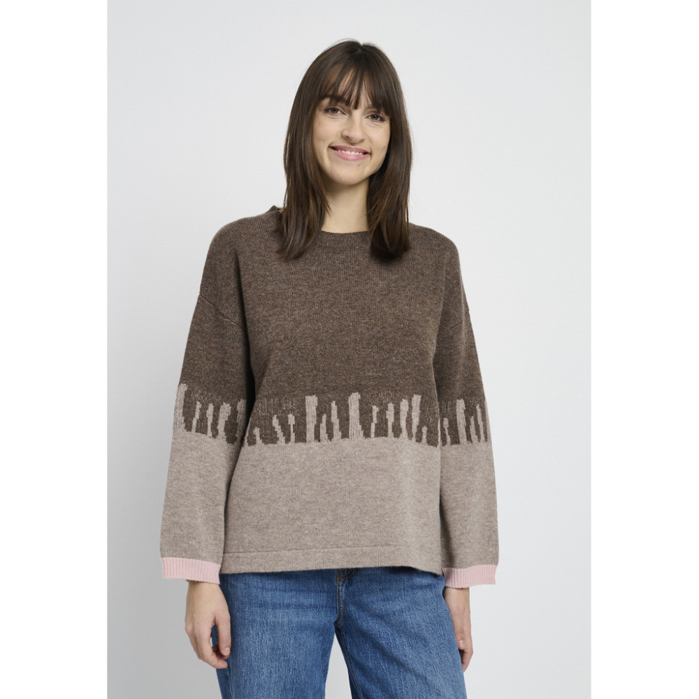 Lind SCora D.Brown Mel En vakker og særegen strikkegenser i ren merinoull med et slående mønster over bryst og ermer. Genseren har en avslappet, rett passform med rund hals og lange ermer. Den myke merinokvaliteten...