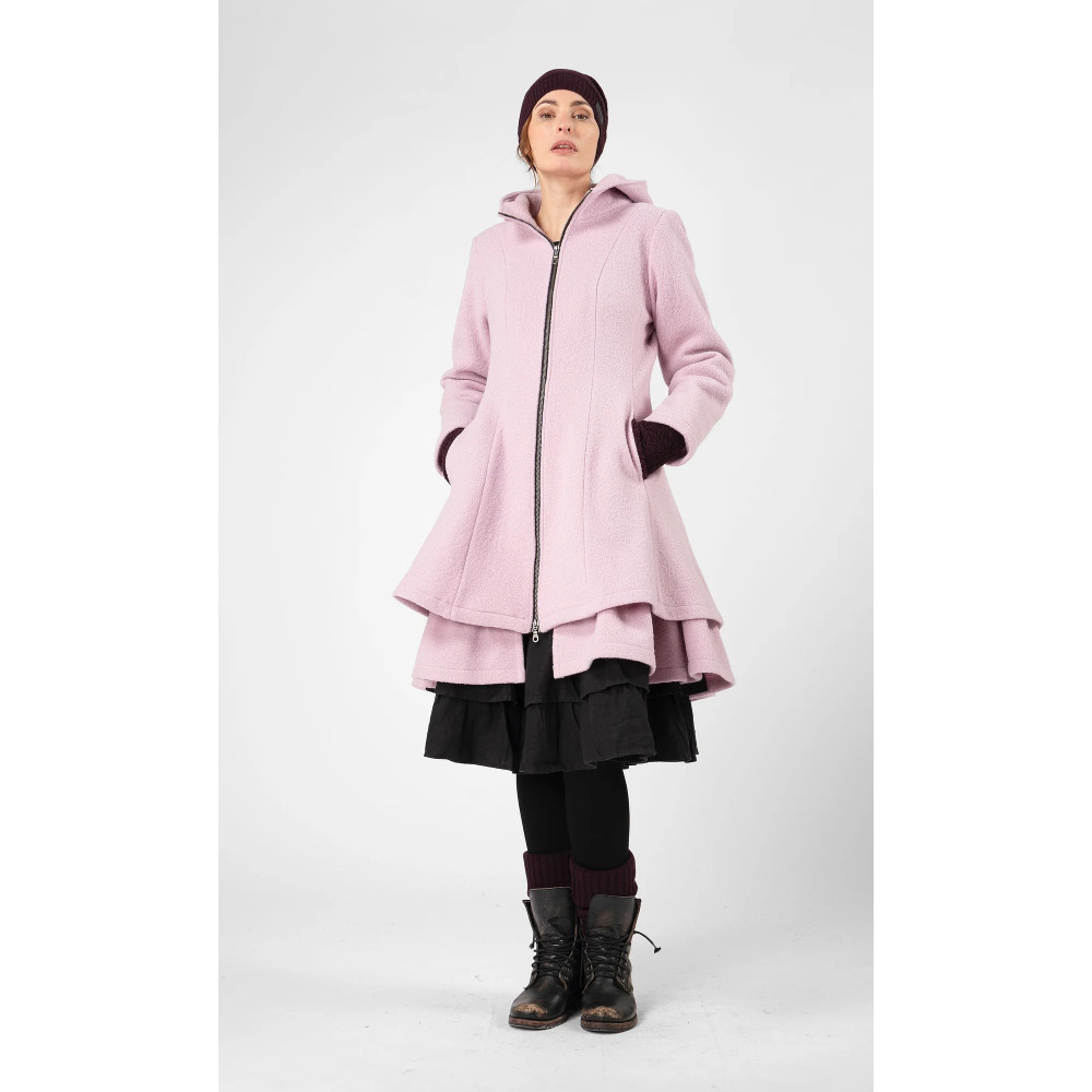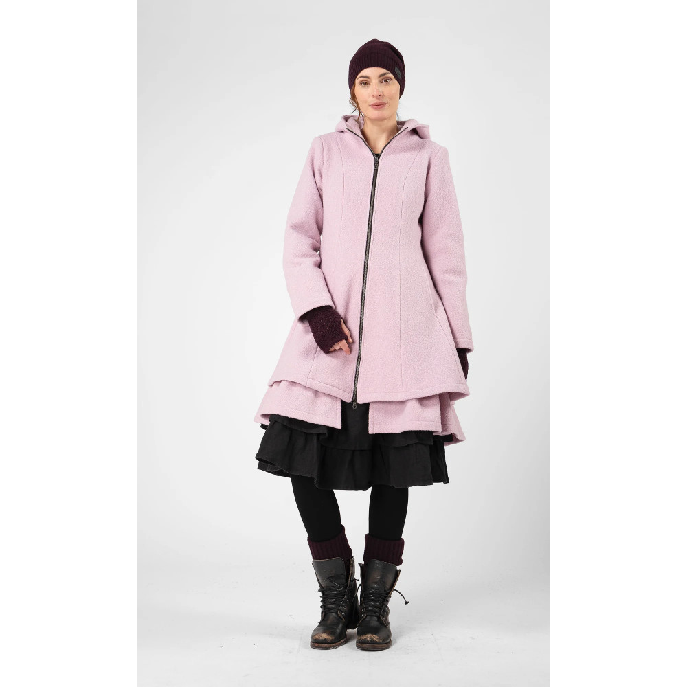Olars Ulla YXIS Coat Rosa Skjønn skjønnhet! Magisk ullfrakk med stor hette i knelang modell, med luksuriøs volang festet til fôret nederst. Smidig midje og deilig vidde nederst. Helfôret og lukkes med glidelås. Laget...