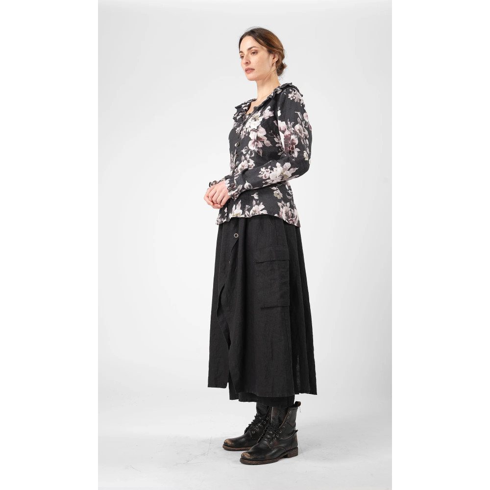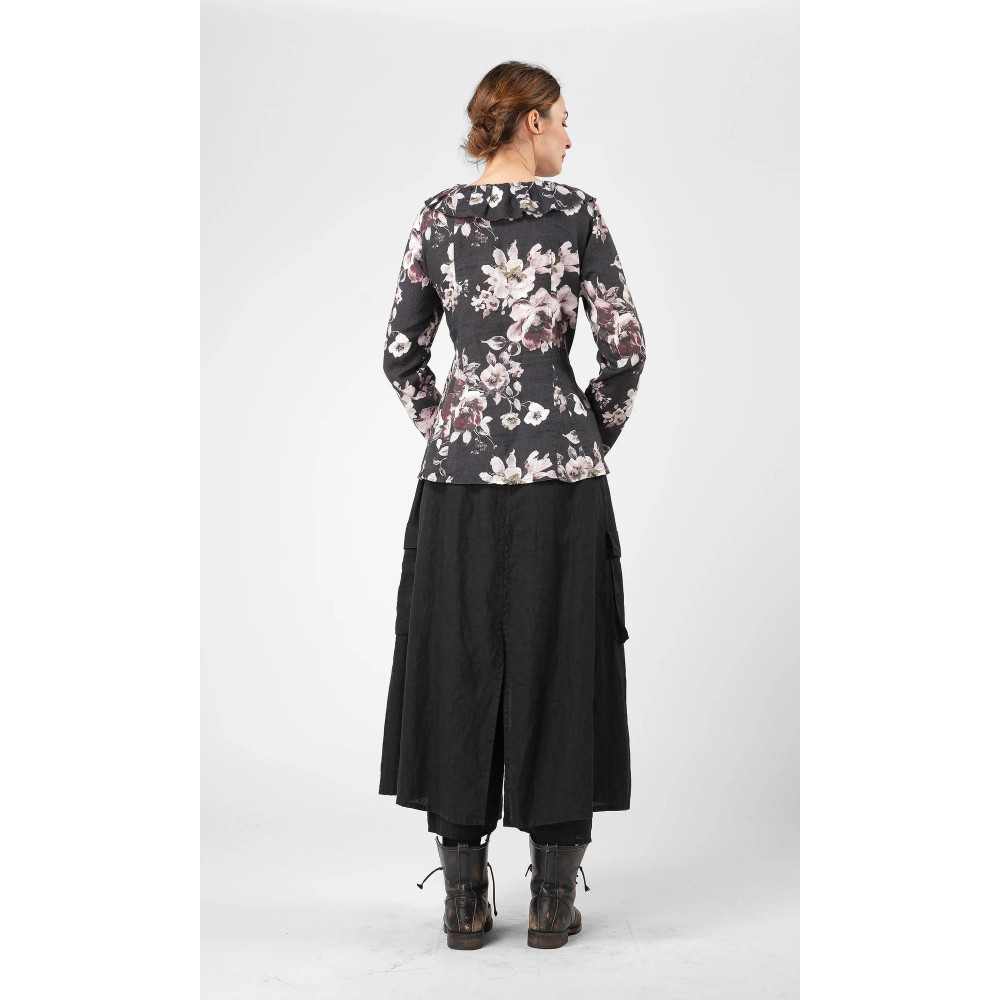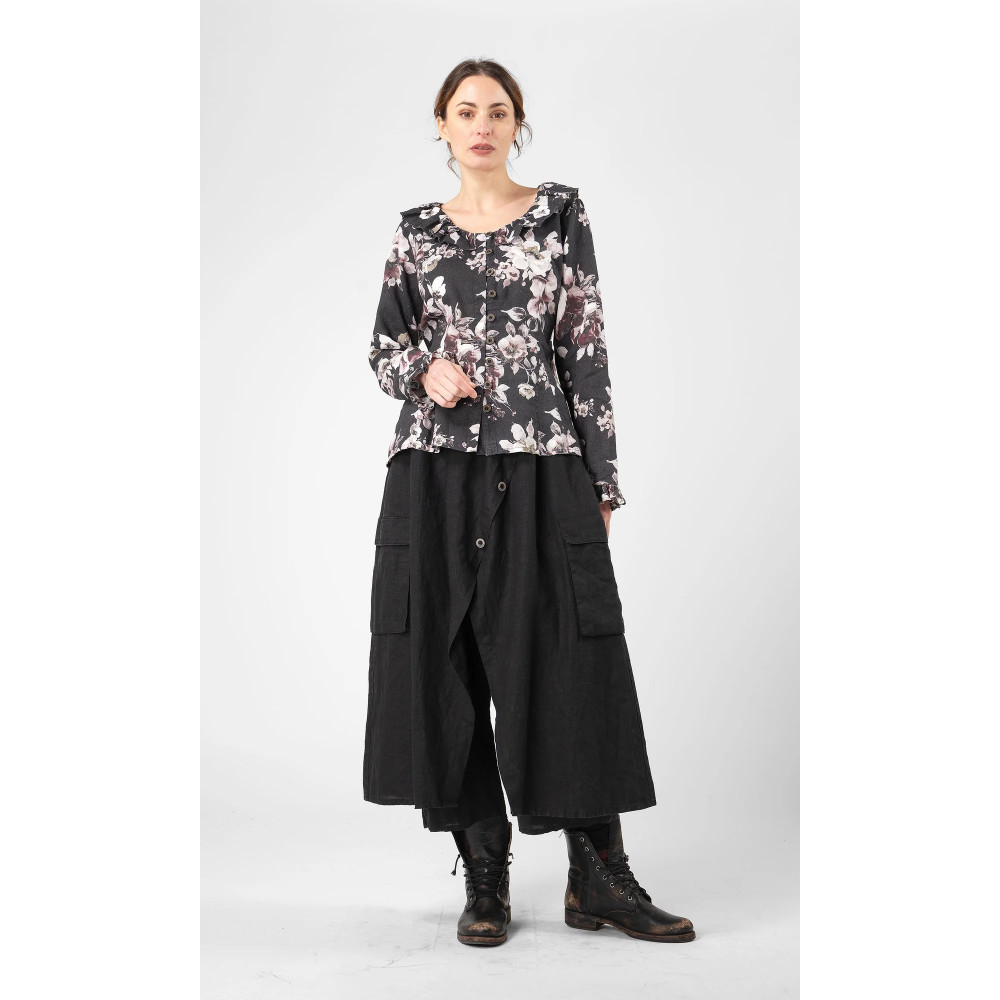Olars Ulla Jass Svart Blomma Jazz eller blues?Jazz er blusen med intrikate detaljer.Stilig dekorert med rysjer i halsen og på ermene.Knappelukking foran og oppbrettet midje. Laget i Europa.. Normal passform. Modellen...