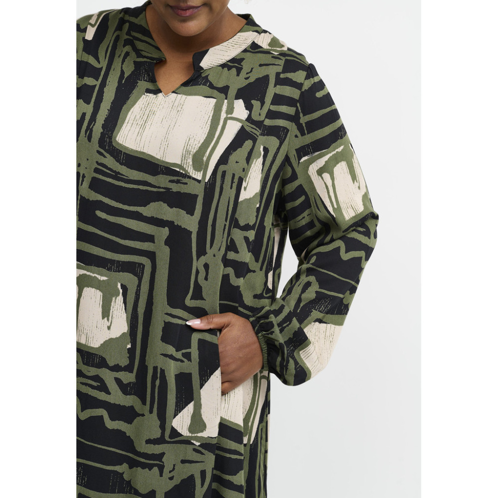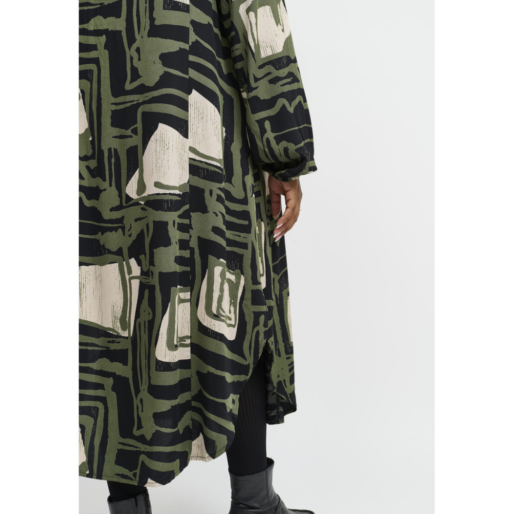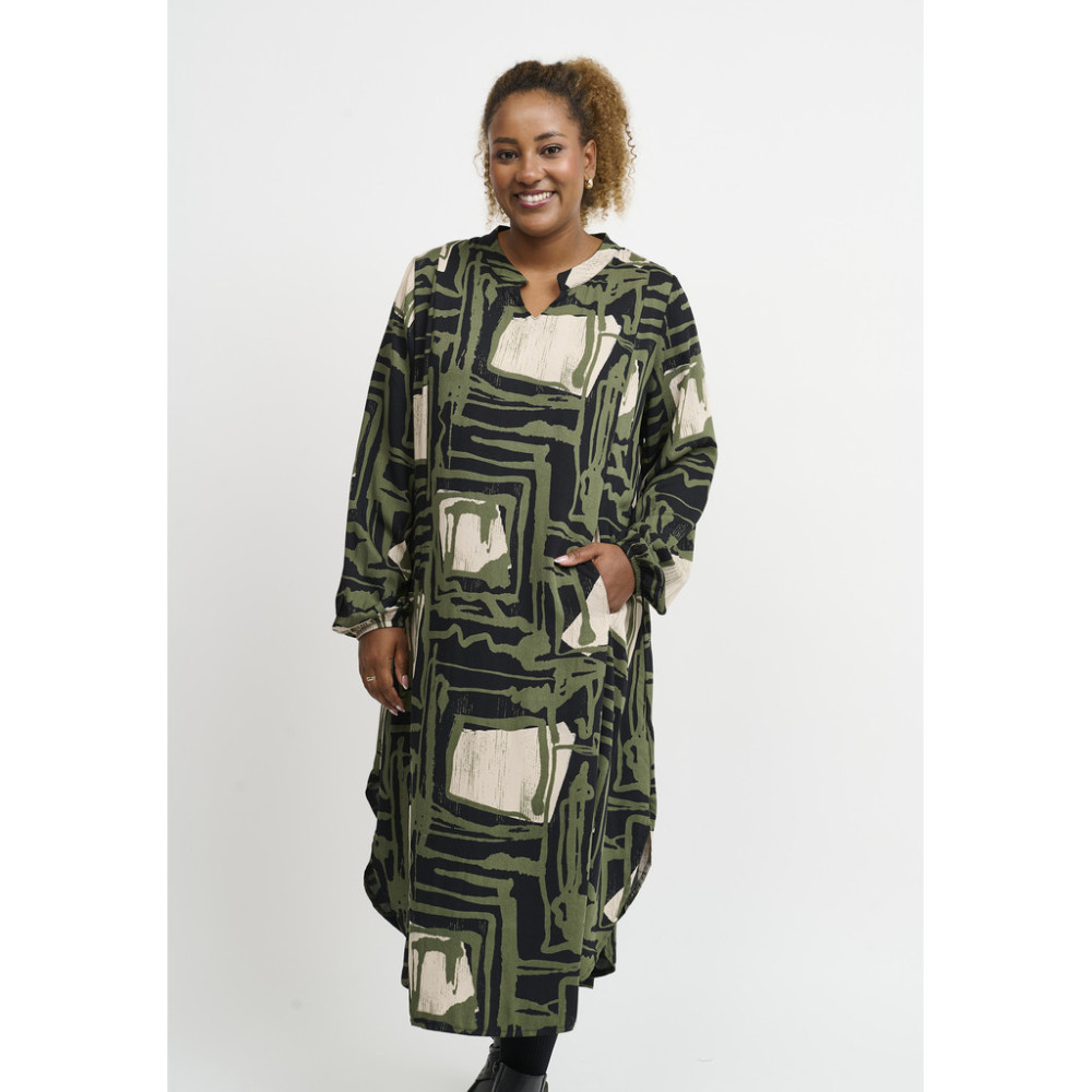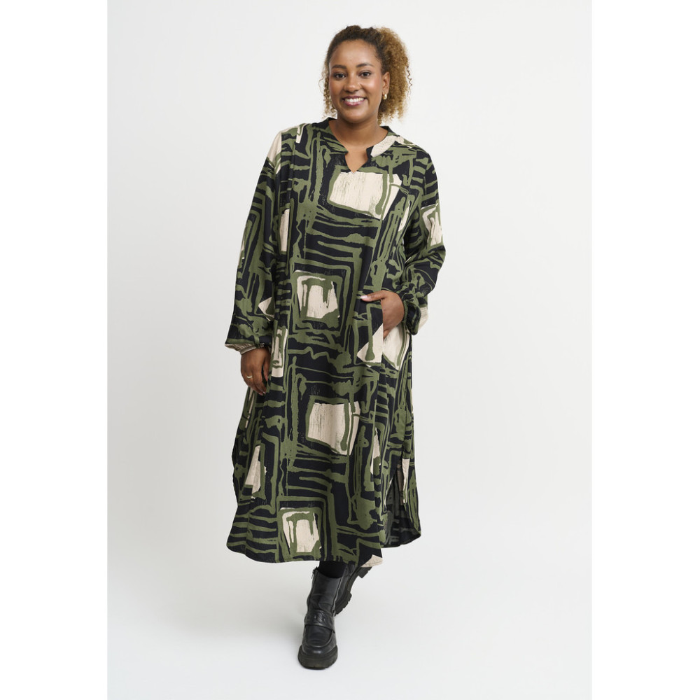 En lang, luftig kjole med et særegent grafisk trykk i dypgrønne og nøytrale toner. Den flatterende A-formede fasongen og det lette viskosestoffet gir vakkert fall og god bevegelsesfrihet. Med lange ermer, rund hals og praktiske sidelommer er den både funksjonell og stilig.