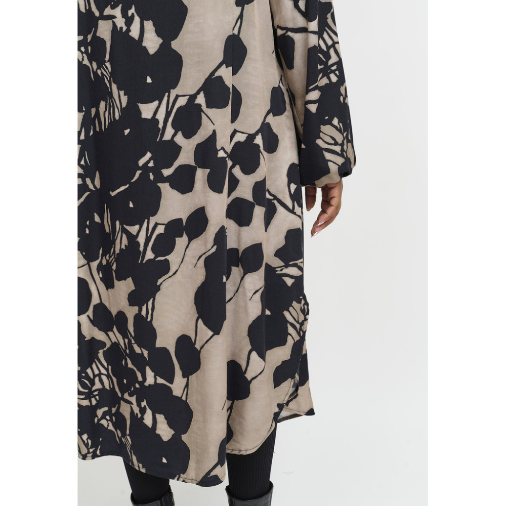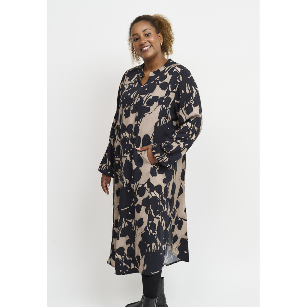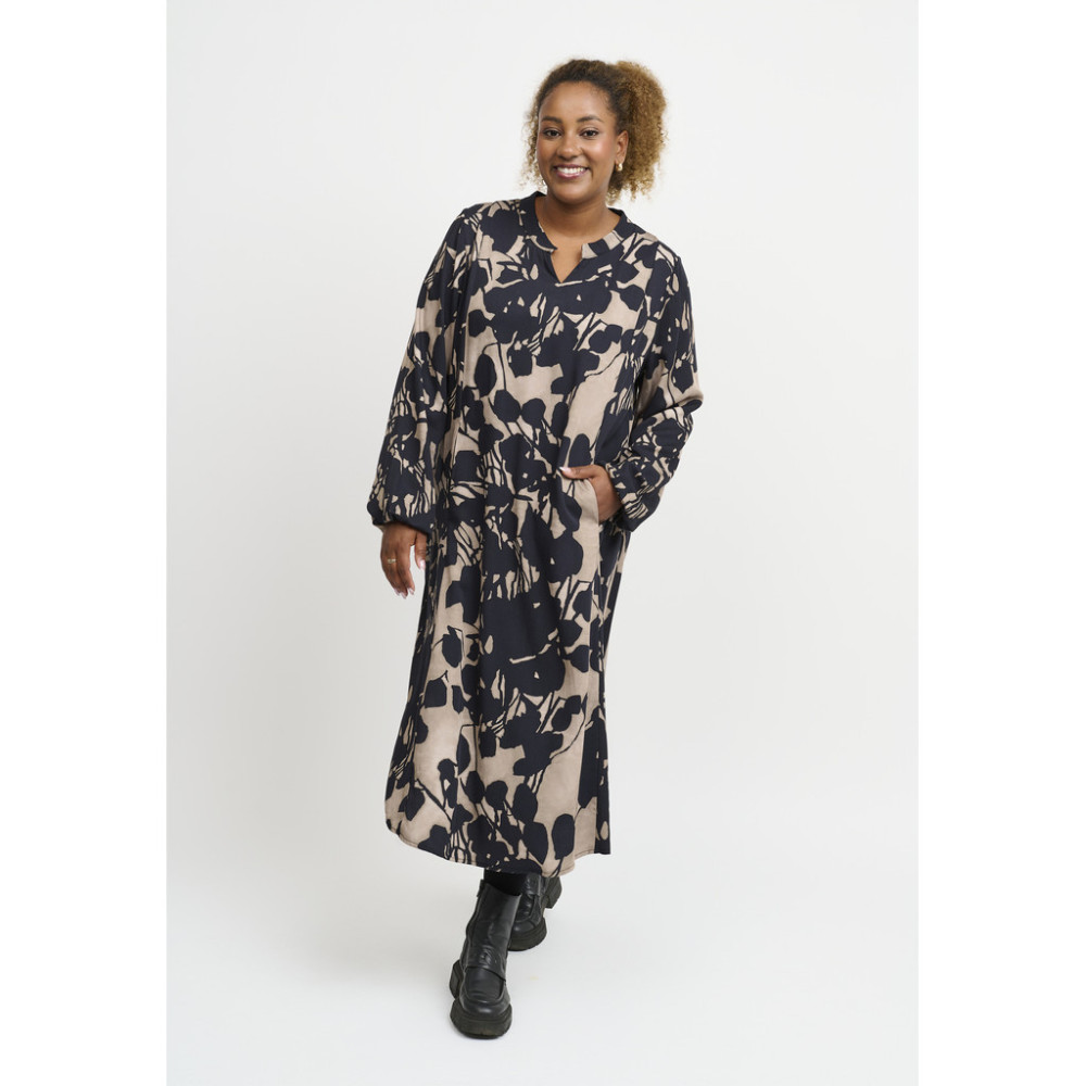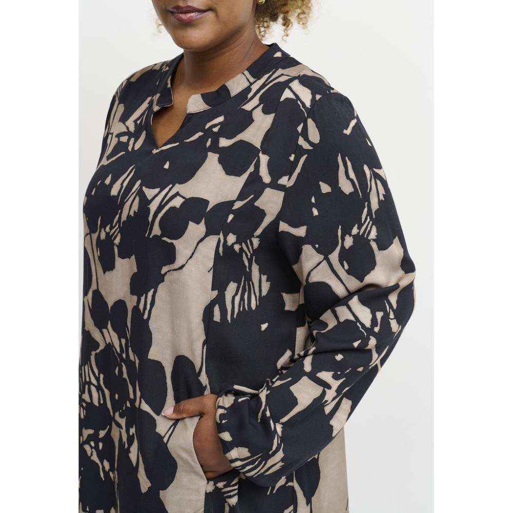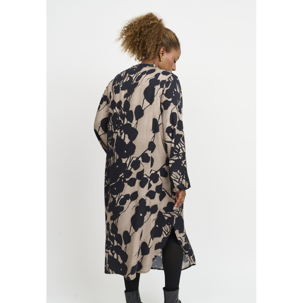 En lang og elegant kjole med et kunstnerisk trykk i kremfarget og svart, som gir et sofistikert og moderne utseende. A-formen gir god vidde og et vakkert fall, mens det rene viskosestoffet...