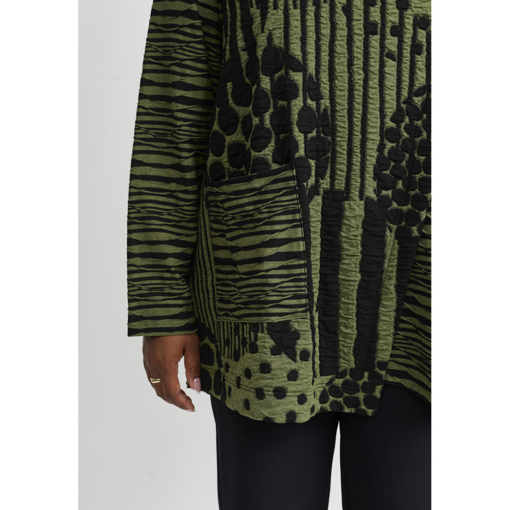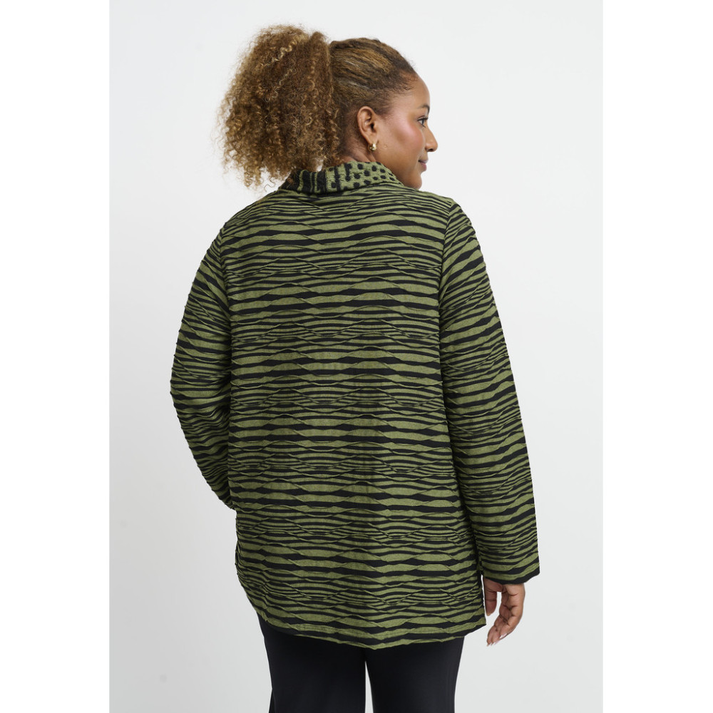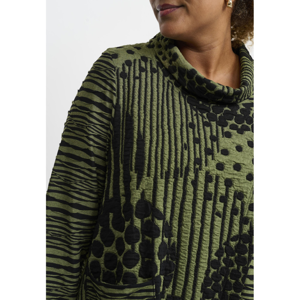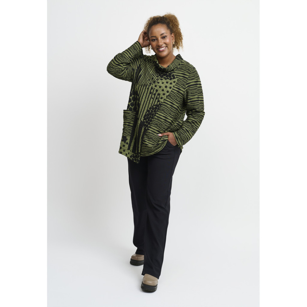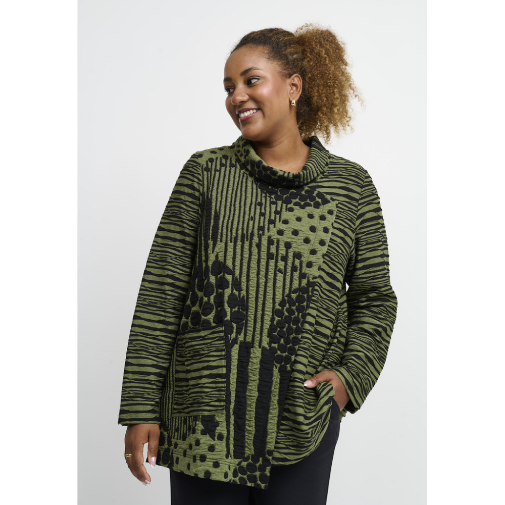 En kreativ og komfortabel bluse med et unikt grafisk trykk i vakre grønntoner. Den A-formede silhuetten gir et feminint og avslappet utseende, mens de asymmetriske detaljene og dekorative knappene...