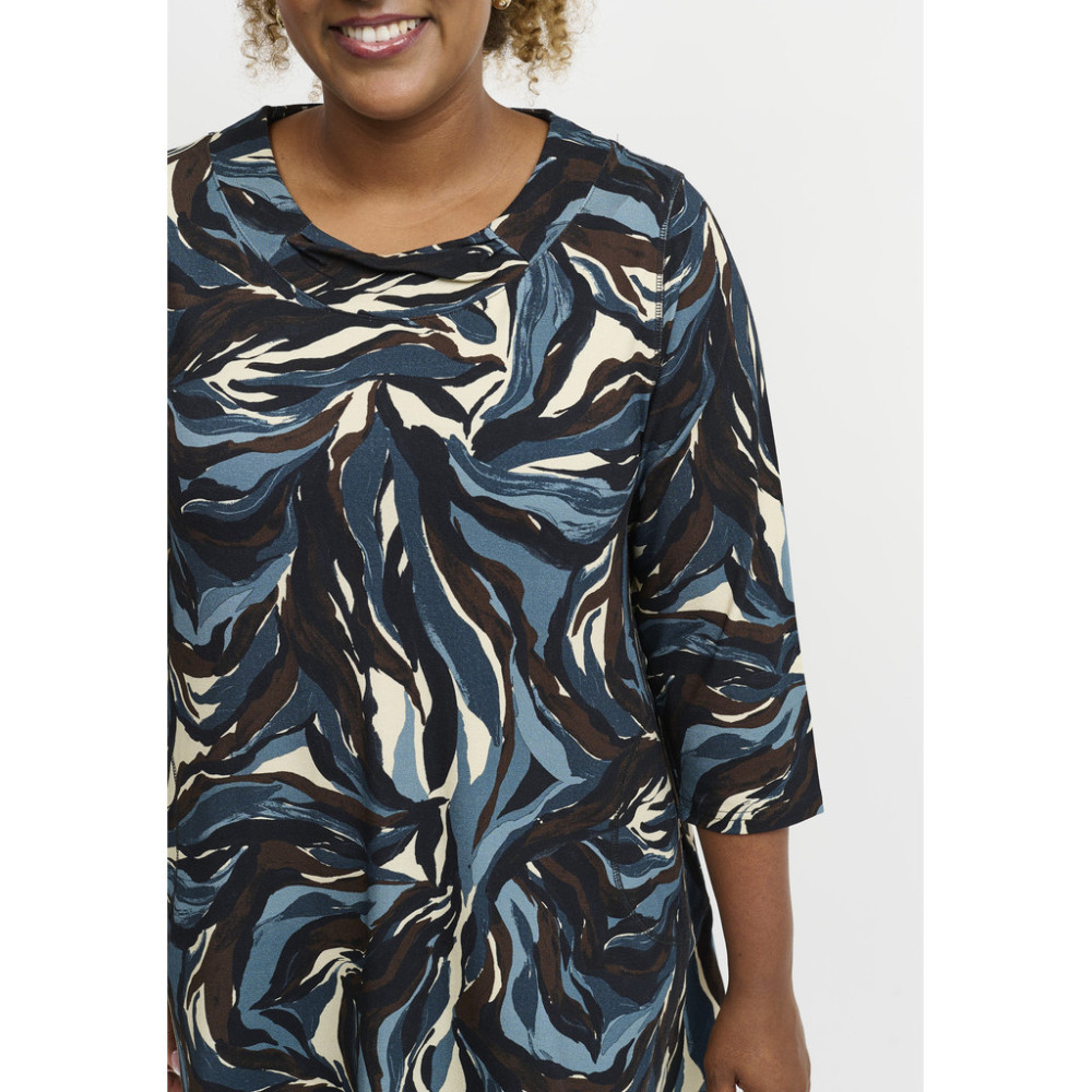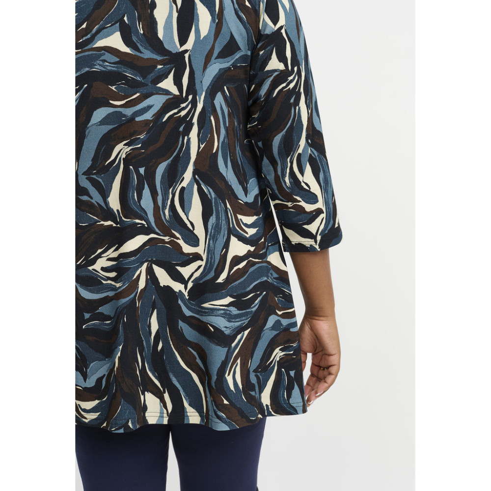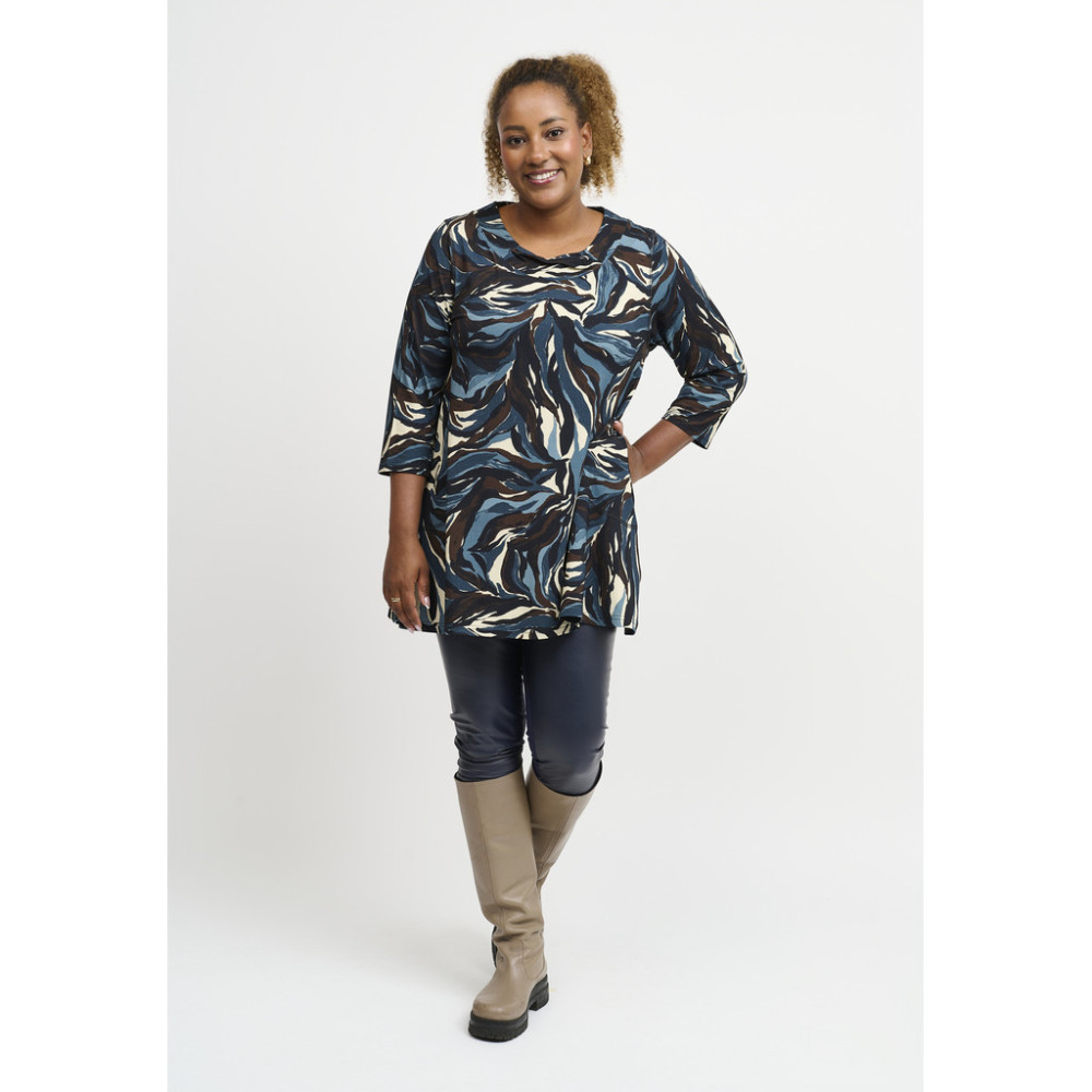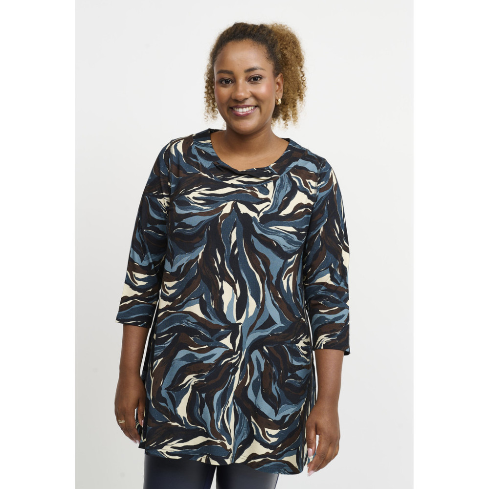 En dristig og fargerik tunika med et kunstnerisk virveltrykk og en avslappet, feminin silhuett. A-formen faller mykt fra skuldrene, noe som skaper en flatterende og komfortabel fasong. Den elastiske viskosekvaliteten sikrer en myk følelse og god bevegelsesfrihet, og de 3/4-lange ermene gjør den enkel å style året rundt.