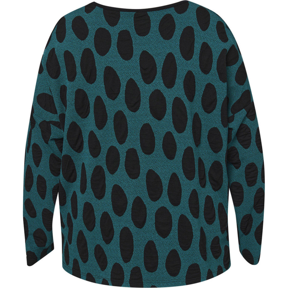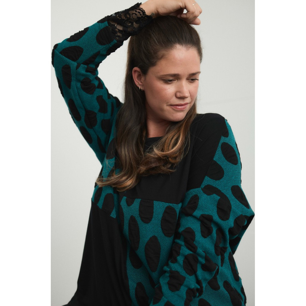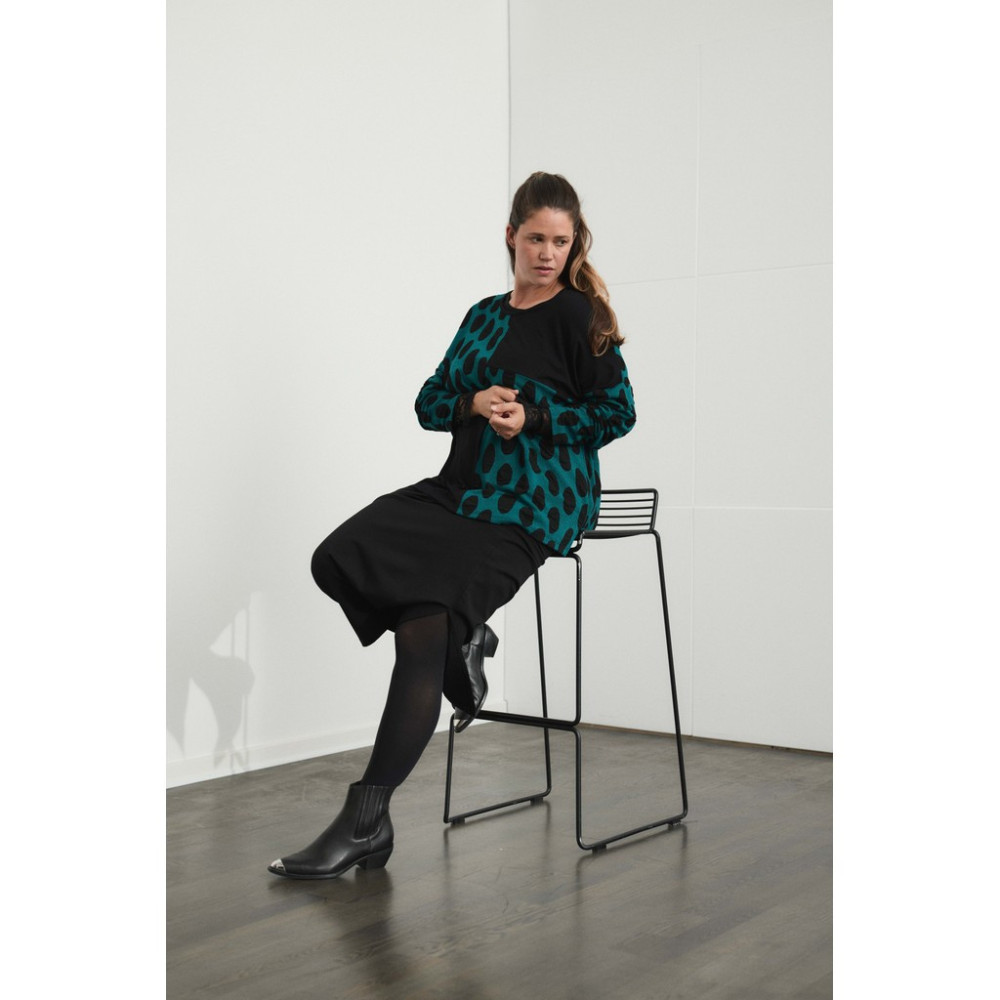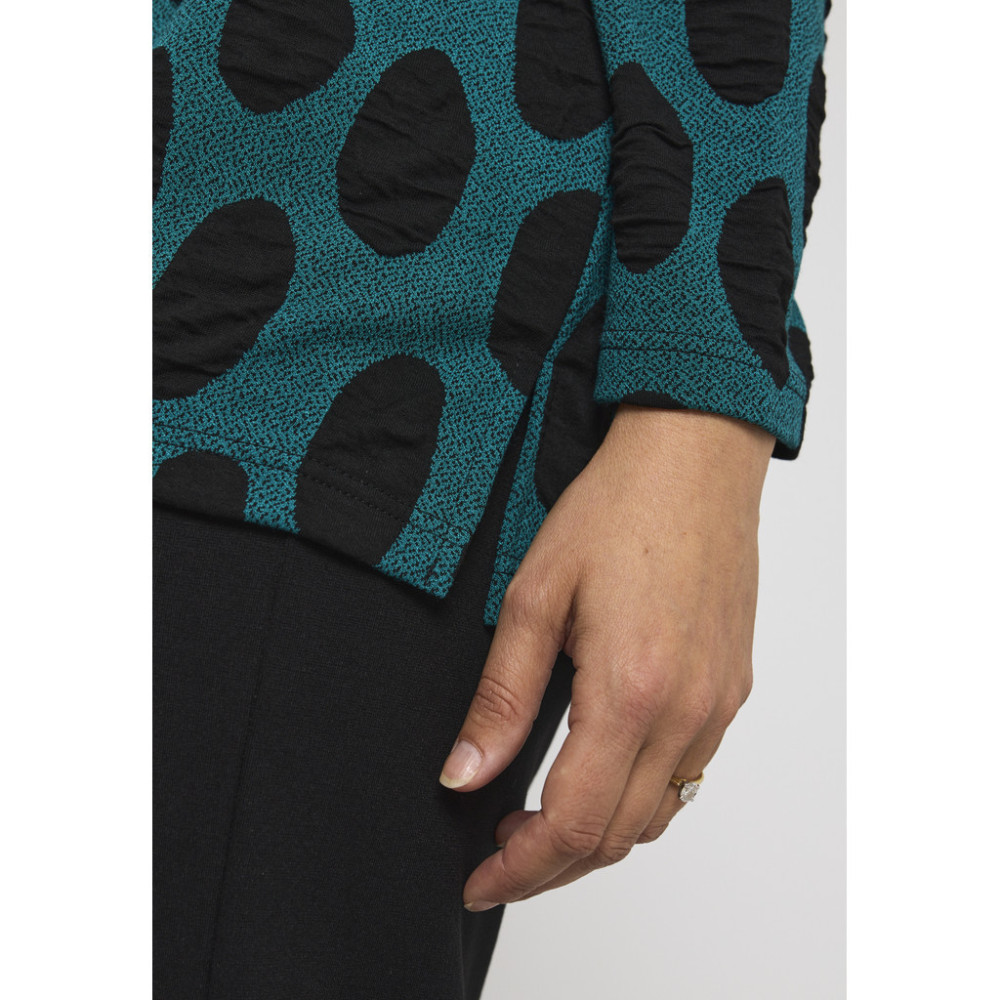 Denne blusen skiller seg ut med sitt grafiske trykk i dype turkise nyanser på en svart base. Den rette, avslappede passformen gir den et uanstrengt utseende, mens den myke viskoseblandingen med...