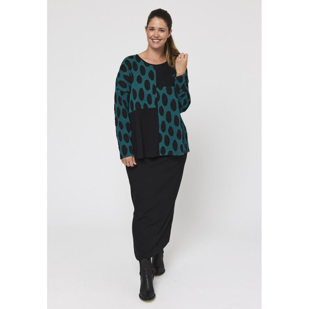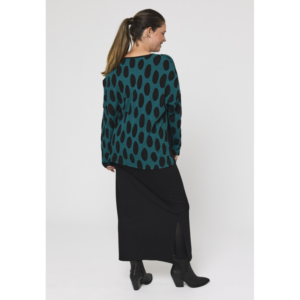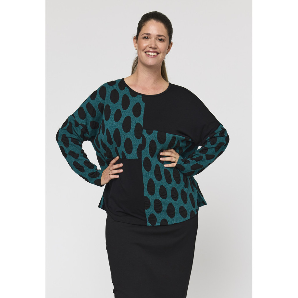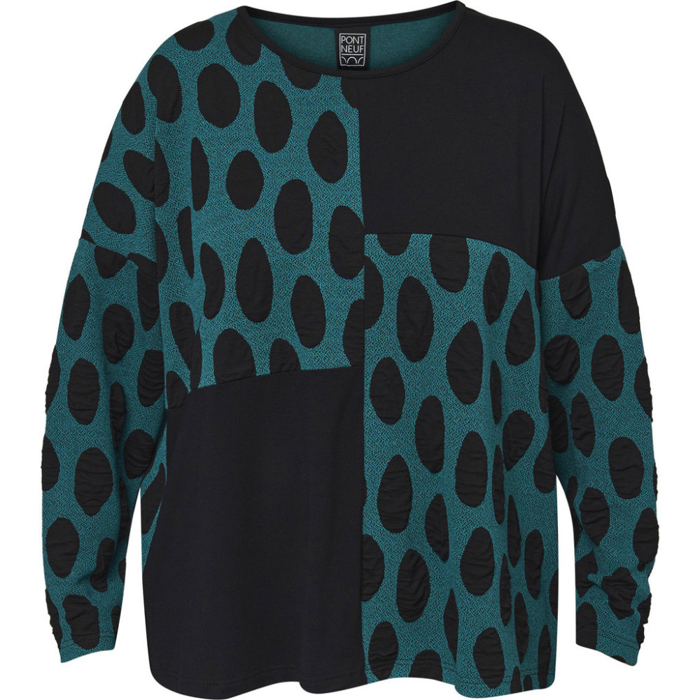 Denne blusen skiller seg ut med sitt grafiske trykk i dype turkise nyanser på en svart base. Den rette, avslappede passformen gir den et uanstrengt utseende, mens den myke viskoseblandingen med...