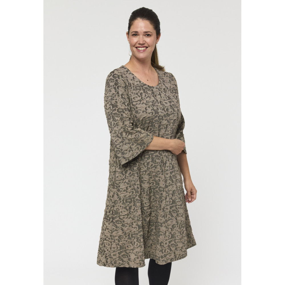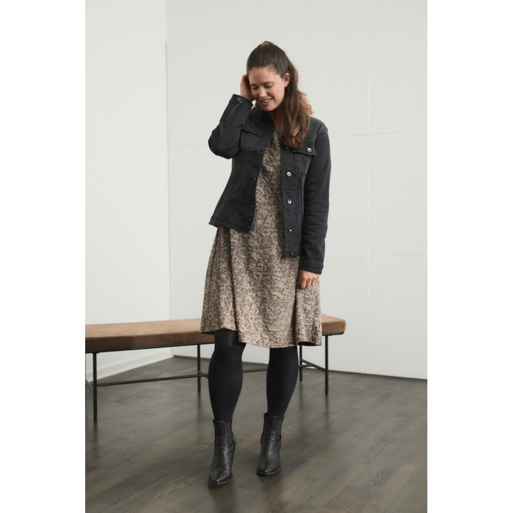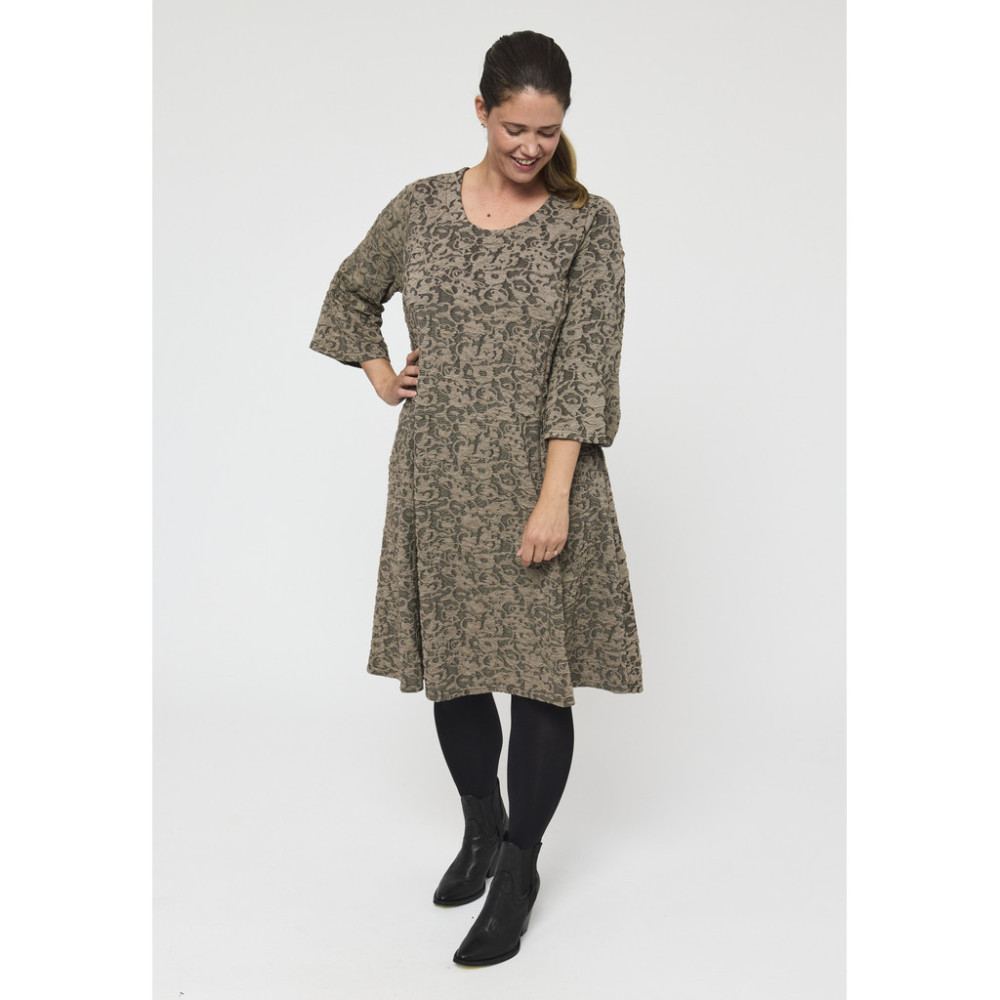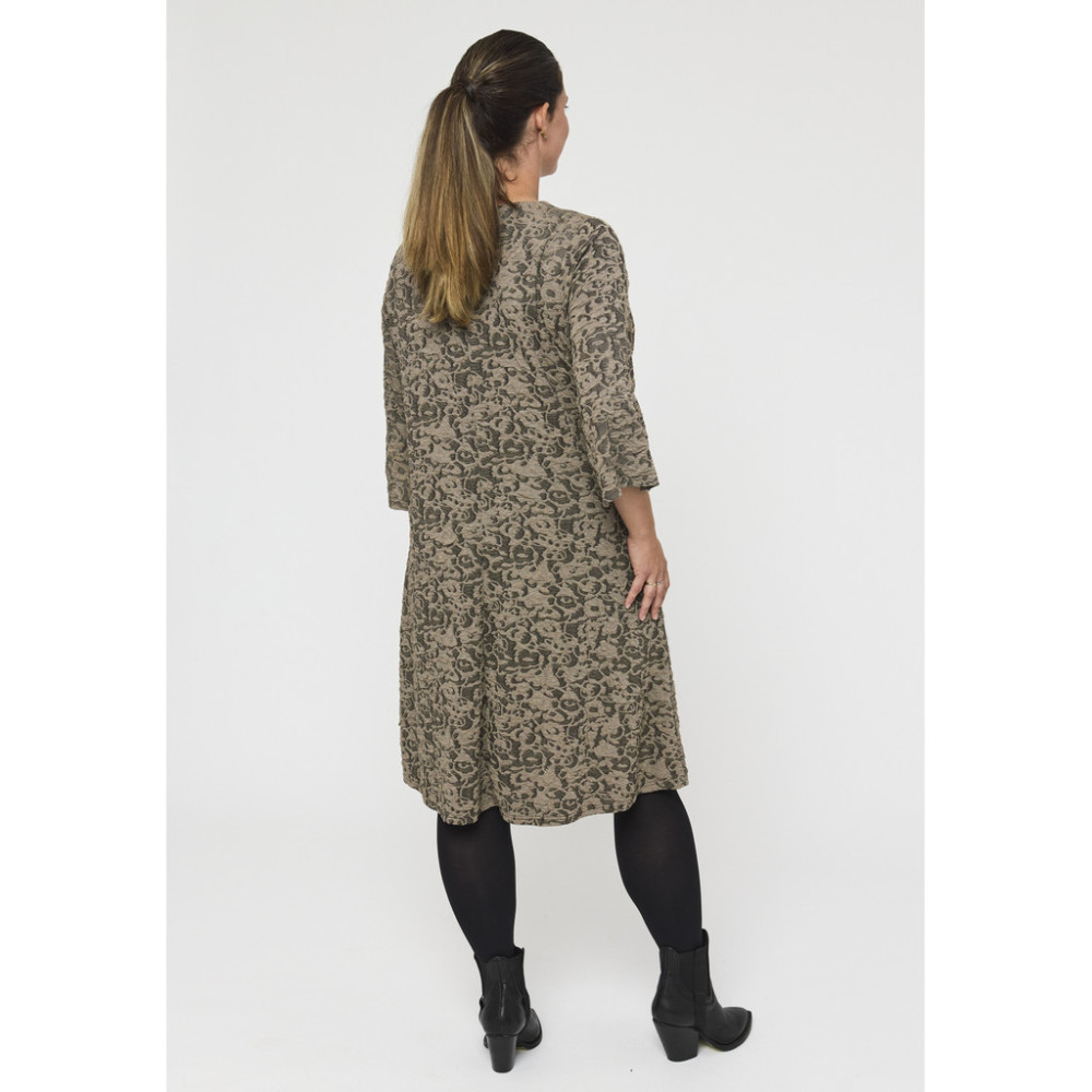 Denne A-formede kjolen er designet med en myk V-hals og lange ermer, noe som skaper et elegant, men likevel avslappet utseende. Skjørtets svake utsving gir naturlig bevegelse, mens det subtile...